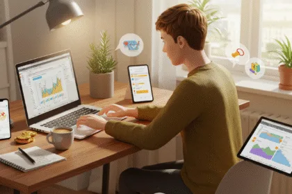 A realistic home office scene in 2025 with a young professional working on a laptop at a desk, surrounded by coffee, plants, and digital devices, symbolizing multiple ways to earn money online from home